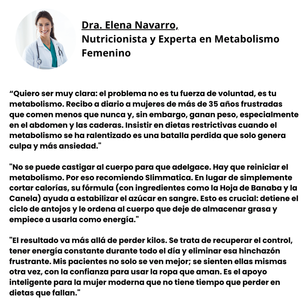 Entre el trabajo y los niños, vivía permanentemente agotada. Mi energía estaba a cero y mi barriga crecía cada mes. Buscaba algo que funcionara sin obligarme a cambiar toda mi vida, porque no tengo tiempo. Slimmatica fue ideal. Lo primero que noté fue el regreso de la energía. ¡Se acabó el bajón de las 3 de la tarde! Luego, el peso empezó a bajar, sobre todo en la cintura. Me siento más ágil, he perdido 7 kg y mi ropa me queda bien otra vez. Es la mejor inversión que he hecho en mí misma en años.
